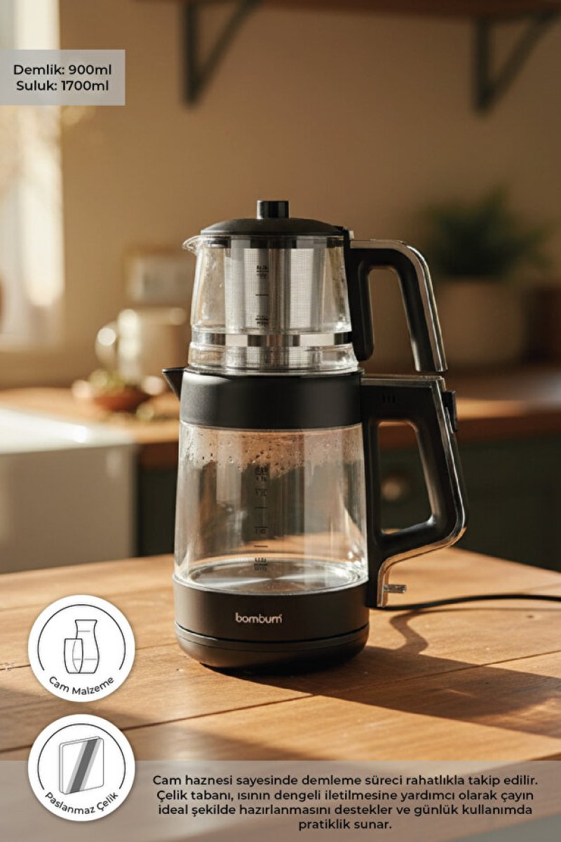 Bambum Safir Cam Hazneli Çay Makinesi Siyah